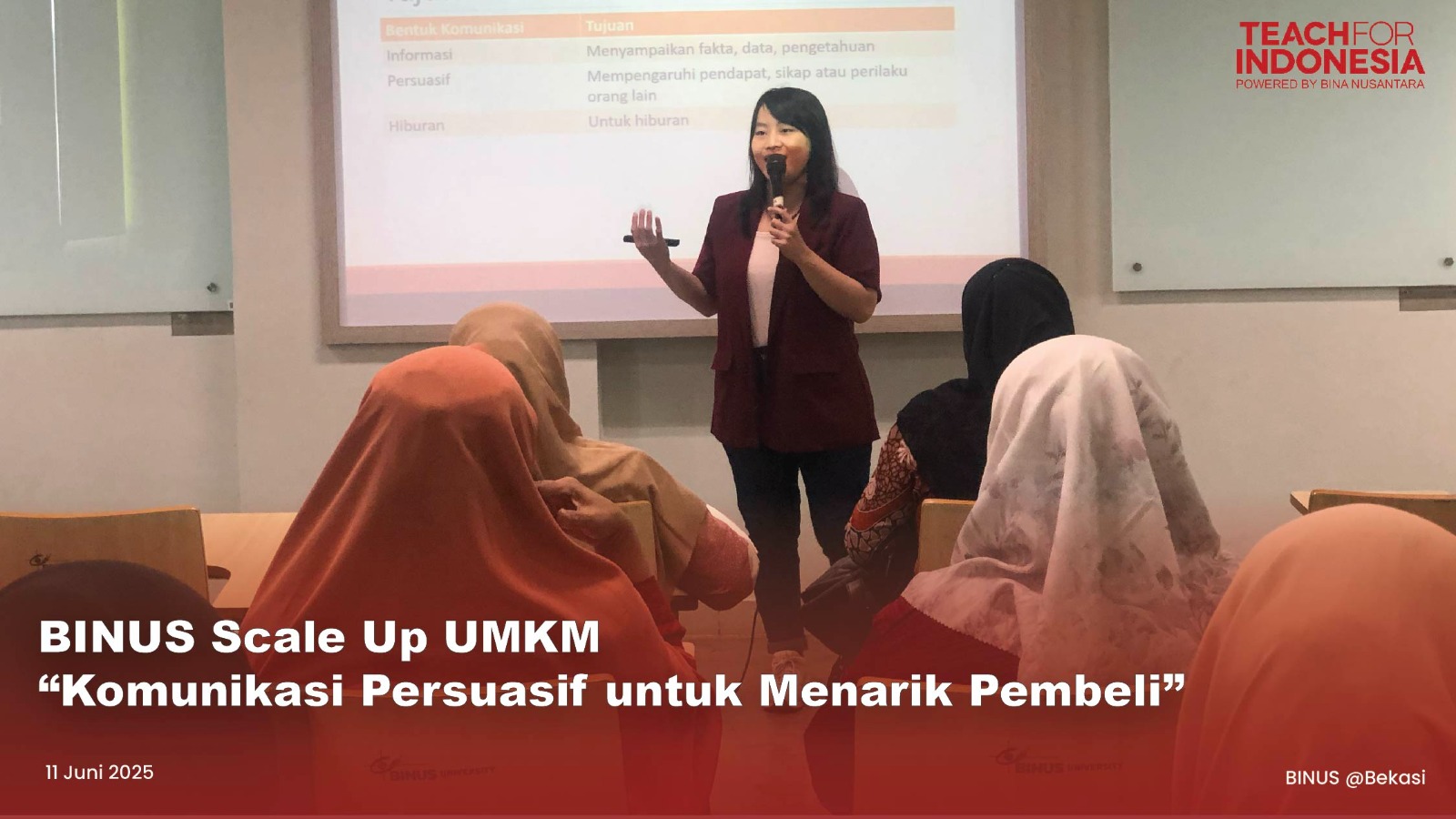 BINUS kembali mengadakan kegiatan BINUS Scale Up pelaku Usaha Mikro, Kecil, dan Menengah (UMKM). Pada kesempatan kali ini, kegiatan yang mengusung tema “Komunikasi Persuasif untuk Menarik Pembeli” sukses diselenggarakan pada Rabu, 11 Juni 2025 di BINUS @Bekasi. Kegiatan ini dirancang untuk membekali pelaku UMKM dengan keterampilan komunikasi yang efektif dan persuasif, guna meningkatkan kemampuan mereka dalam menjangkau konsumen serta mendorong penjualan produk.