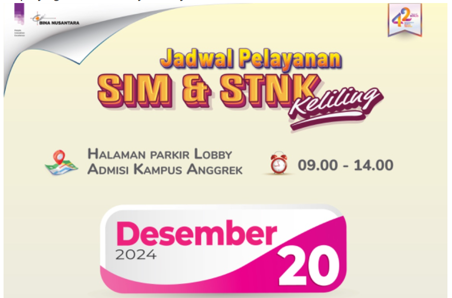 - Public Service: BINUS collaborates with Samsat Jakarta Barat to provide services for the extension of driver’s licenses (SIM) and vehicle registration certificates (STNK). This service is open to both BINUS and the public