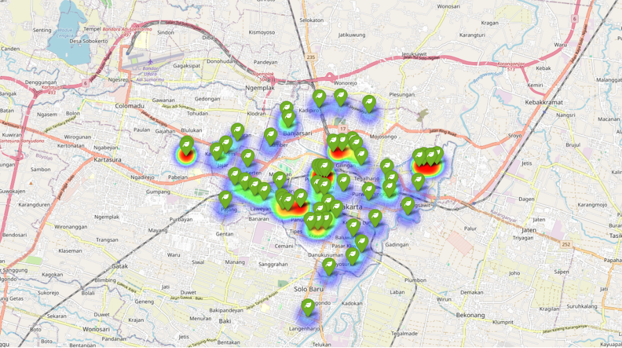 - Hasil: Kode menghasilkan peta interaktif dengan Heatmap. Seperti yang terlihat pada studi kasus Solo, area yang lebih merah menunjukkan konsentrasi (kepadatan) penjual jus yang sangat tinggi, sedangkan area biru menunjukkan kepadatan yang rendah.