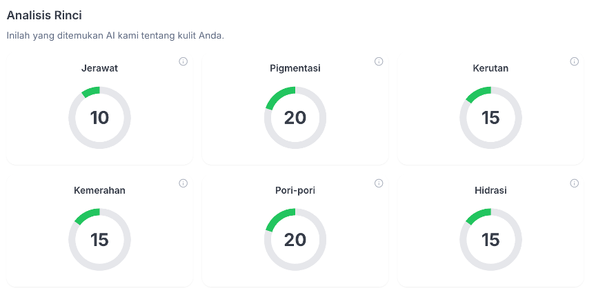 Skor numerik (seperti 10/100) pada Jerawat atau Pigmentasi memberikan insight yang lebih actionable dan terukur daripada deskripsi kualitatif.