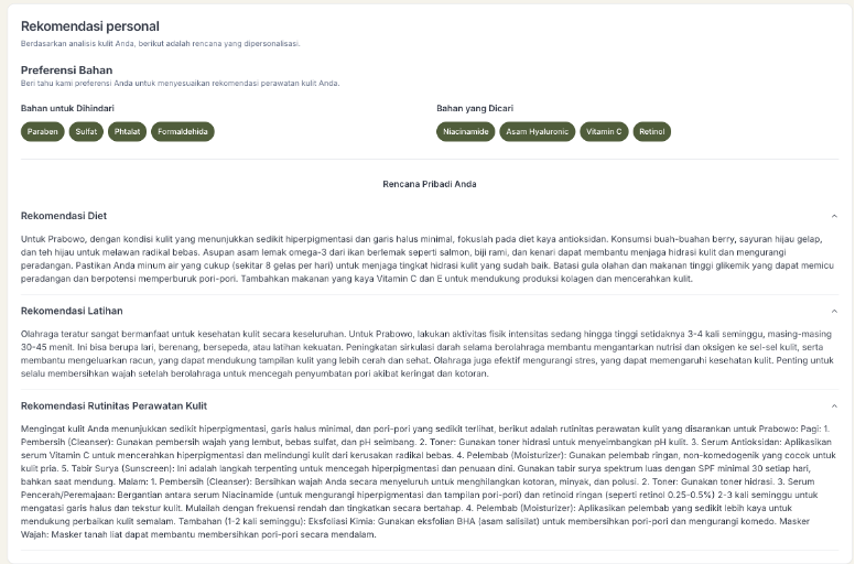 • Jika skor Jerawat (10) rendah, sistem merekomendasikan: “Lanjutkan rutinitas Jerawat Anda. Prioritas saat ini adalah mencegah Pigmentasi memburuk.”