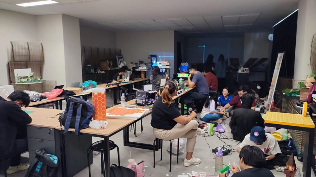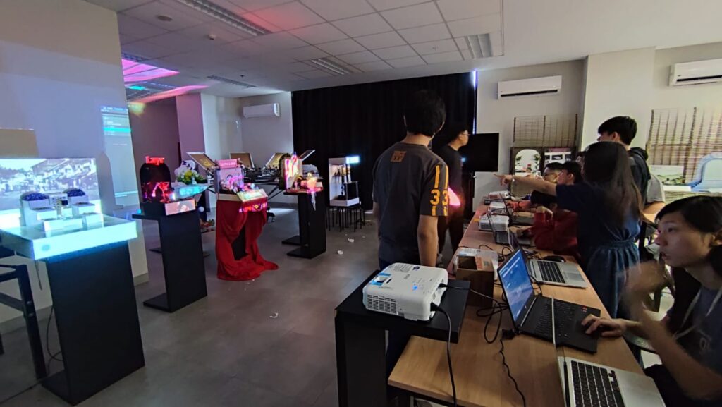 Kelas Visualization for Immersion Design DKV Binus @Semarang juga mengadopsi pendekatan kolaboratif, di mana mahasiswa dari latar belakang ilustrasi, desain interaktif, dan sinematografi dapat bersinergi. Mahasiswa diajak membentuk tim kecil, melakukan design sprint, dan menguji konsep mereka langsung di ruang gelap studio yang disimulasikan sebagai ruang instalasi.