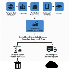 Meningkatnya permintaan terhadap produk akibat pertumbuhan penduduk, urbanisasi, perubahan gaya hidup, serta kemajuan teknologi, mendorong rantai pasok untuk bekerja lebih cepat dan dalam skala yang lebih besar. Namun, hal ini turut mempercepat laju ekstraksi bahan mentah dan menciptakan tekanan terhadap sistem logistik yang menghasilkan lebih banyak limbah serta emisi karbon.
